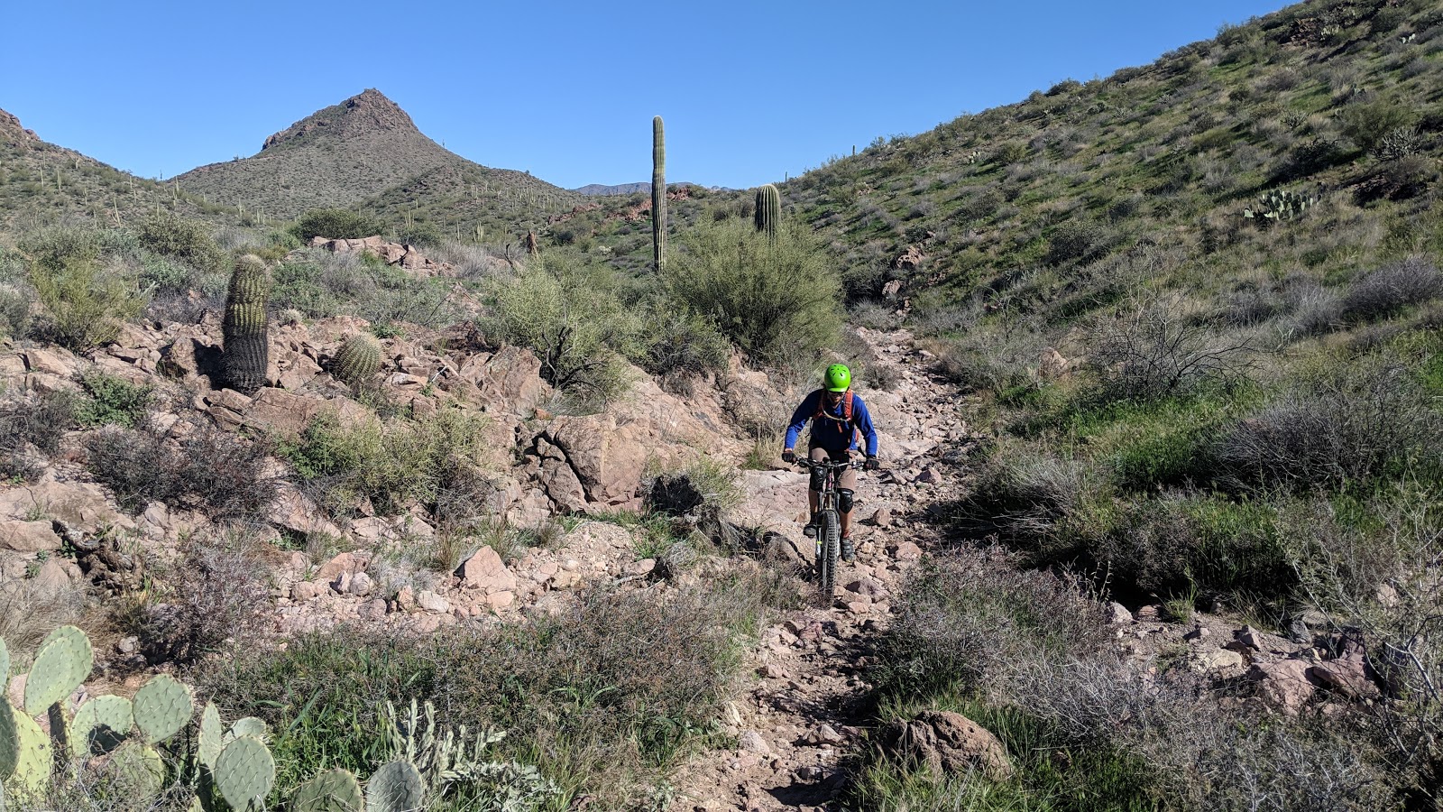 This new trail is sure to become a local favorite. It has really nice routing using the topography, splits between two giant Saguaros, has a few jumps built into natural features and has plenty of speed in sections. Well done, trailbuilders, well done.